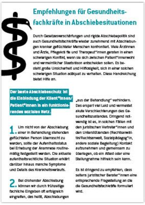 Die vorliegende Handreichung soll Klinikmitarbeiter*innen über ihre Rechte und Möglichkeiten in Abschiebesituationen aufklären und dazu ermutigen, sich selbstbewusst am Wohl der Patient*innen zu orientieren.
